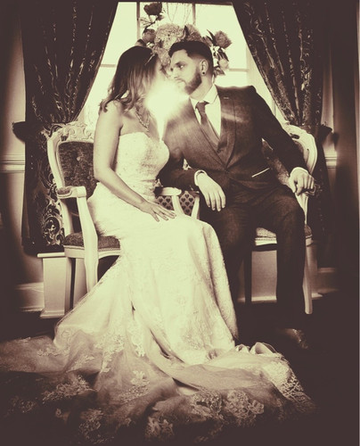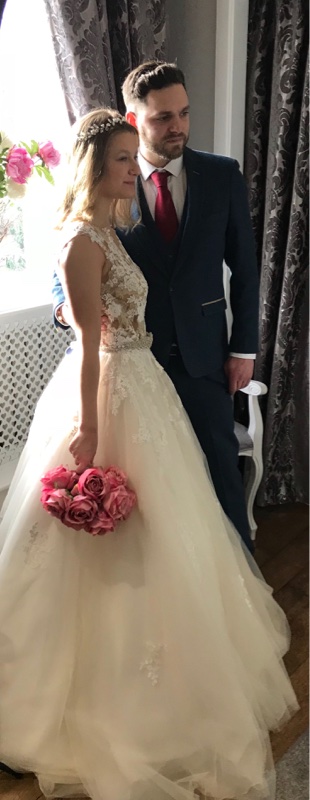 Classic strapless wedding dress, diamante embroidered throughout, beautiful bodice, framed by a sweetheart bust exposes the shoulders and back, creates a darling silhouette and highlights Yasmins tiny frame.
